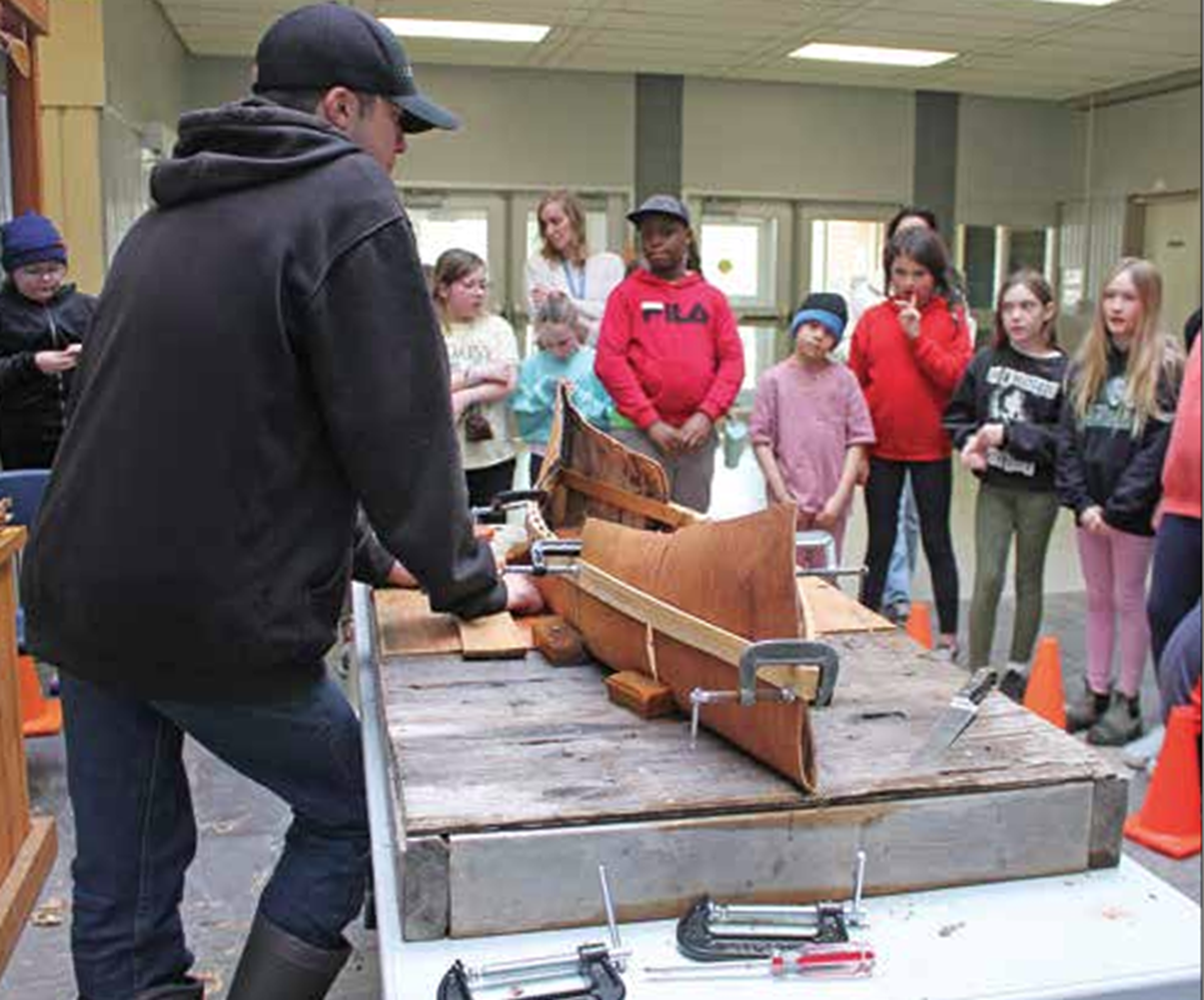 Alex Labelle built a four-foot birch bark canoe last week while fielding questions from students at J. Douglas Hodgson Elementary School.