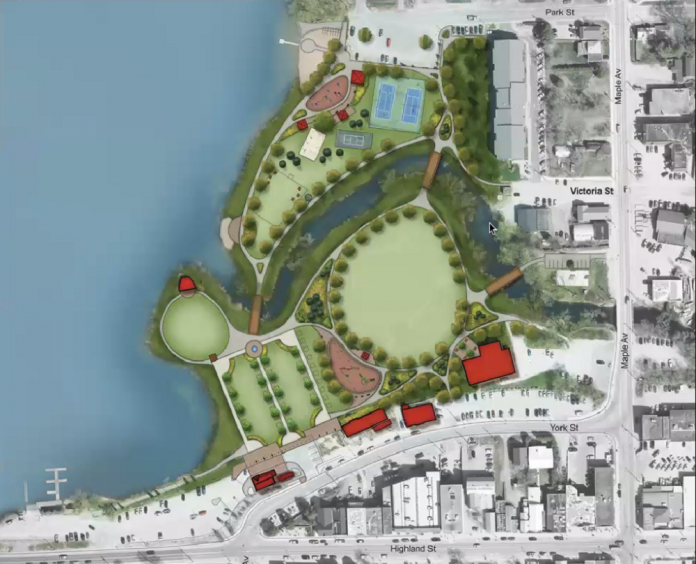 Peterborough-based architectural firm Basterfield and Associates was hired to oversee the plan’s creation and revealed its draft to a group of municipal officials and stakeholders Oct. 20. The plan envisions a massive transformation of the park and proposes additions such as a splash pad, off-leash dog park, a new northern bridge and pathway improvements.